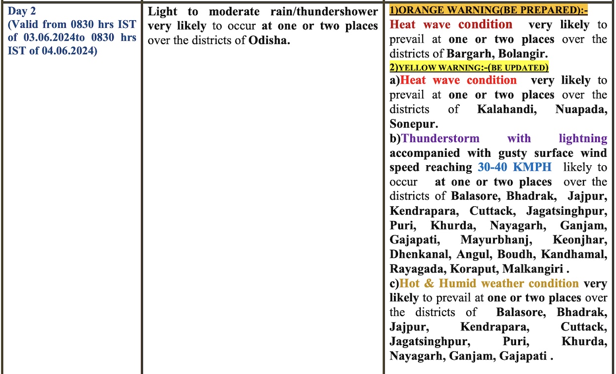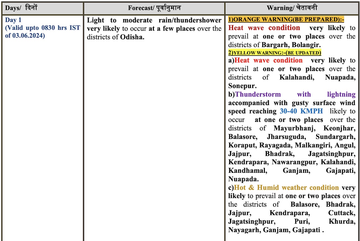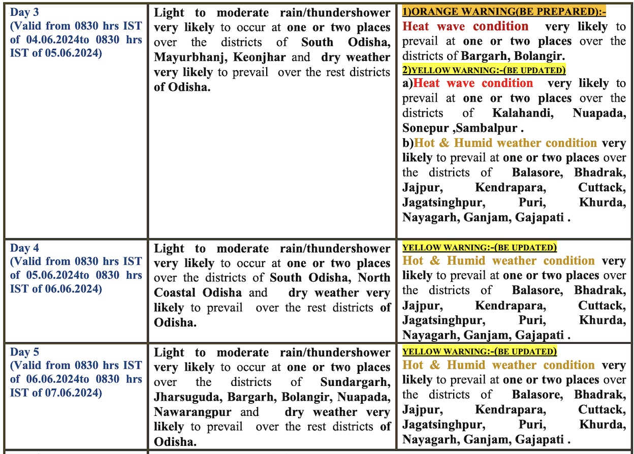 Orange warning has been sounded for Balangir and Bargarh and yellow warning for Kalahandi, Nuapada, Sonepur on June 2-3-4, she added.