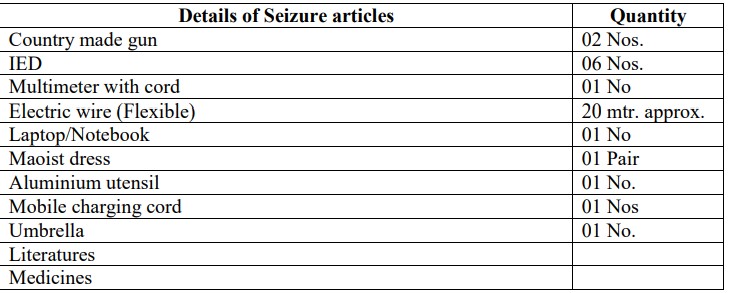 After two days of extensive search, a major Maoist dump was busted near a forested area of Katwapadar village under Kartanpalli gram panchayat and a huge quantity of IEDs, arms, laptop/notebook, multimeters, medicines including oral contraceptives, which shows the exploitative nature of cadres towards females, and other incriminating articles were recovered.