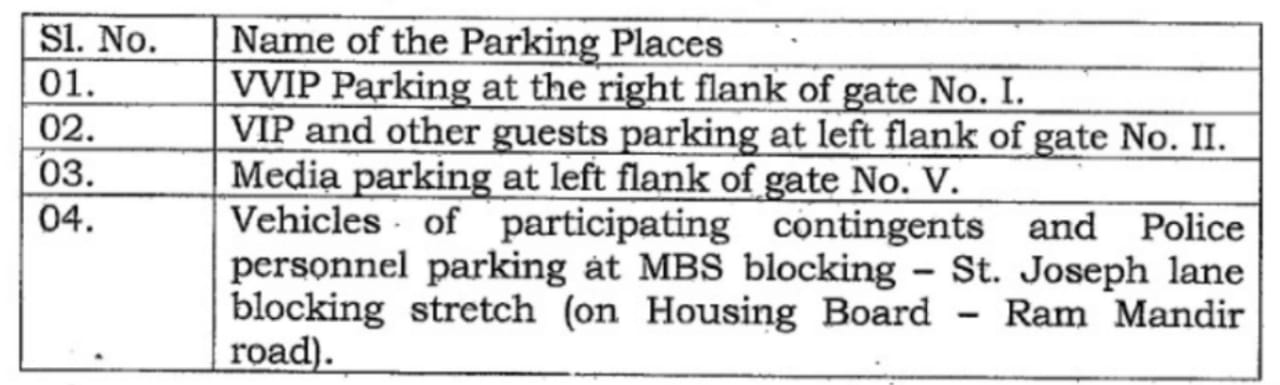 I. No vehicles shall be allowed to ply in between NIBS blocking — St Joseph lane blocking a stretch of Ram Mandir and Housing Board Square from 6.30 am onwards till the parade is over.