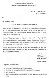 The letter was addressed to Jani Master and continued, “Hence, the invitation extended to Shri Shaik Jani Basha for the 70th National Film Awards Function to be held at Vigyan Bhavan, New Delhi on 8.10.24 is hereby withdrawn.” The choreographer had recently received interim bail from the court to attend the award show.