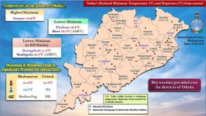The highest maximum temperature of 34 degrees Celsius was recorded at Sonepur and the lowest minimum temperature of 10.8 degrees Celsius was recorded at Phulbani in the last 24 hours.