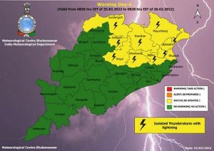Yellow warning: Thunderstorm with lightning very likely to occur at one or two places over Sundargarh, Deogarh, Angul, Dhenkanal, Keonjhar, Mayurbhanj, Jajpur, Bhadrak and Balasore districts.