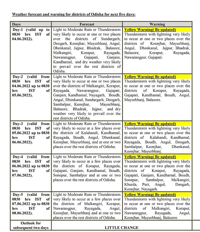 Bhubaneswar: The regional centre of India Meteorological Centre has issued thunderstorm with lightning warning for several Odisha districts for the next five days.