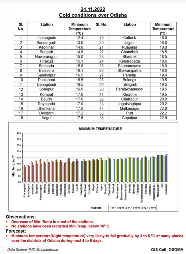 Last night, five places recorded a minimum temperature of 15°C and below. Jharsuguda was the closest place in the state at 12.4°C followed by Sundargarh (13°C), Keonjhar (14°C), Bargarh (14.6°C) and Nabarangpur (15°C).