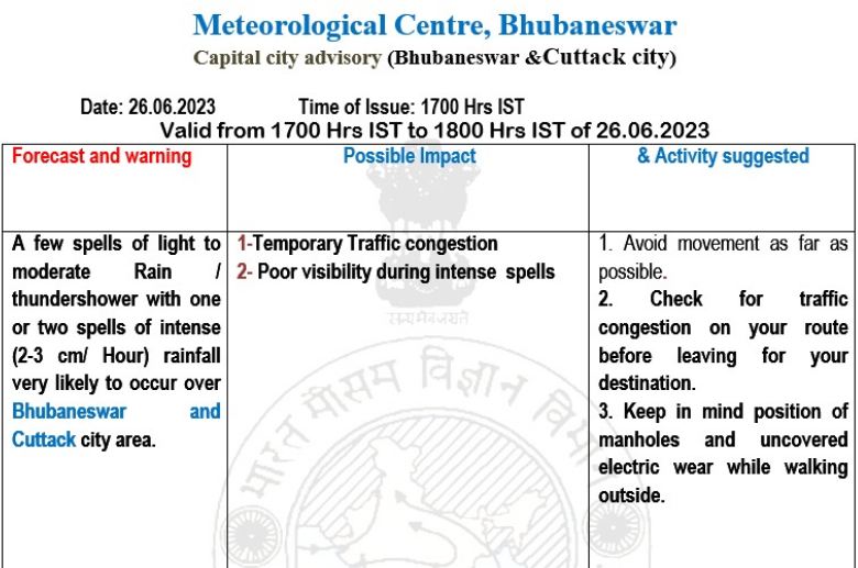 The MeT Centre said moderate rain or thundershower  with one or two spells of intense rainfall likely to affect some parts of the districts of Cuttack, including Cuttack city, and Khudrda, including Bhubaneswar city, within next 2 to 3 hours.