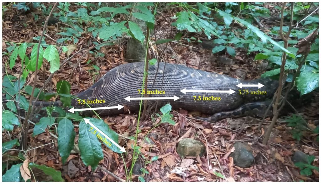 Now, the question about the animal consumed by the python remained unsolved. We have used simple geometrical principles and derived an approximate body length of the animal inside the python’s abdomen. We analysed the photograph provided by the local forest staff and selected the best photo where the bulging of the abdomen was visible fully. We used a ‘Kangda’ plant leaf as a scale to measure the length of the animal inside. Luckily, we have collected some ‘Kangda’ plant leaves; the same leaves that were present in the photographs of the python atop Deulia Mundia hill. The Kangda leaf we measured was about 7.5 inches in length. We draw a straight line on the image of the python with the help of the computer, covering the entire length of the leaf, and put that line one by one covering the entire swelling portion of the python’s body. The total length was covered by 3 full leaf distances and a half. Multiplying 7.5 inches to 3.5 comes to 26.25 inches. Even if we make it up to 27 inches, the length is much (9 inches) shorter than 3 ft (36 inches). The missing Nanda was above 5 ft in height. Therefore, there is no question of a human over 5 ft tall being inside the swelling portion of a python’s abdomen of about 27 inches. Thus, with simple mathematics, we proved that the missing old man of >5 ft height cannot be accommodated inside the <3 ft bulging area inside the python’s abdomen.