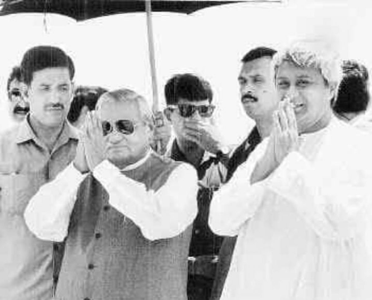 Former PM Atal Bihari Vajpayee addressing news reporters at Biju Patnaik Airport at Bhuhaneshwar after conducting aerial survey of cyclone affected Ganjam district. Giridhar Gamang and BJD president Naveen Patnaik are also seen.