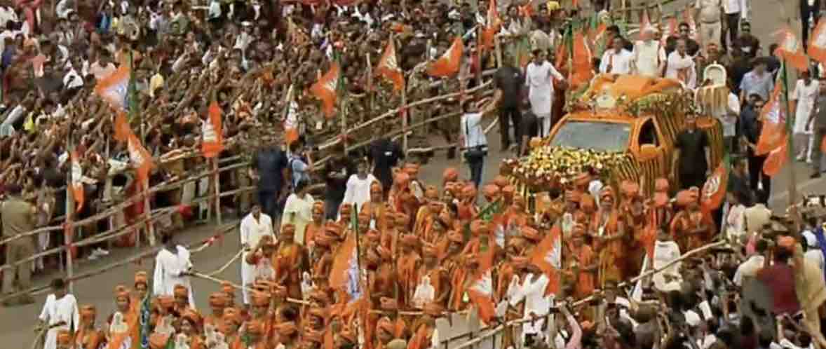Puri: Crowd thronged Badadanda in large numbers to catch a glimpse of Prime Minister Narendra Modi as he embarked on a roadshow in support of BJP candidates from Puri Parliamentary and Assembly constituencies on Monday.