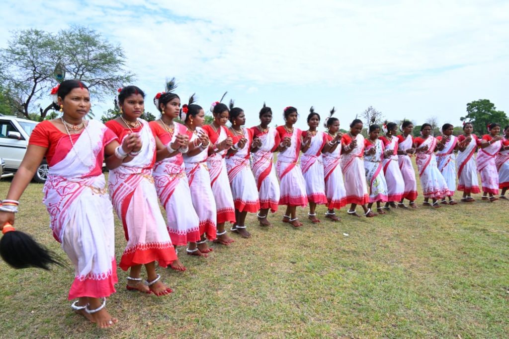 A large number of locals, including tribal girls and women, presented delightful traditional dance to drum beats for the President as she entered the area.