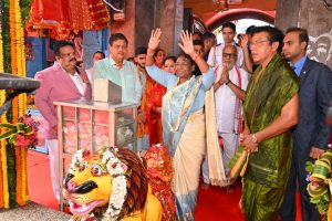 Cuttack: On the second day of her three-day visit to Odisha, President Droupadi Murmu visited the Cuttack Chandi Temple here and offered prayers to the deity. She was accompanied Governor Ganeshi Lal.