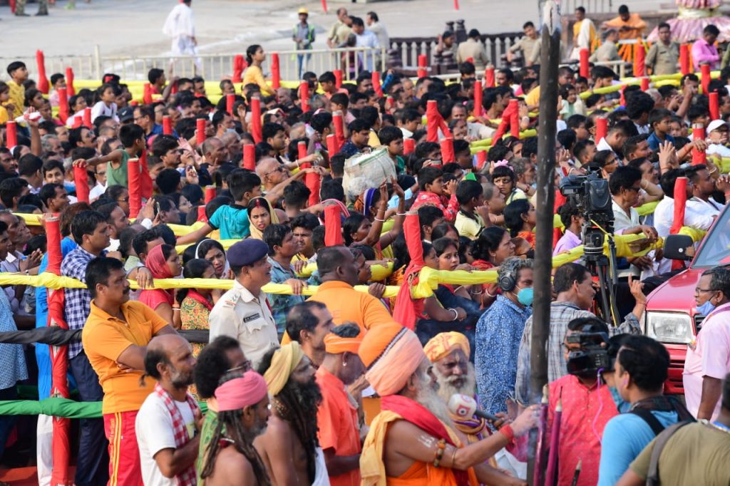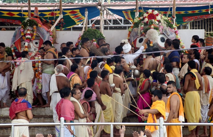 On Tuesday, a sea of devotees thronged pilgrim town Puri to have darshan of Lord Jagannath and His siblings. For the first time, they will be allowed for darshan on Snana Mandap from a close distance, but cannot touch the idols.