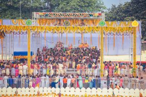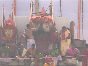 Puri: Puri King Gajapati Dibyasingha Deb performed ‘Chera Pahanra’ ritual at Snana Mandap, an elevated platform where the sibling deities of Jagannath Temple in Odisha’s Puri town were escorted from the sanctum sanctorum and given a ritualistic bath with 108 pitchers of herbal and aromatic water on Sunday.