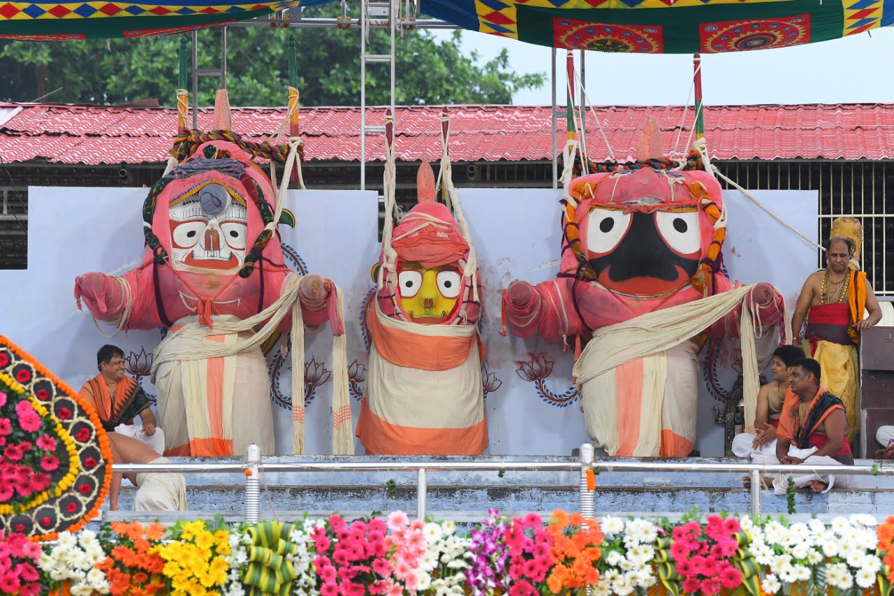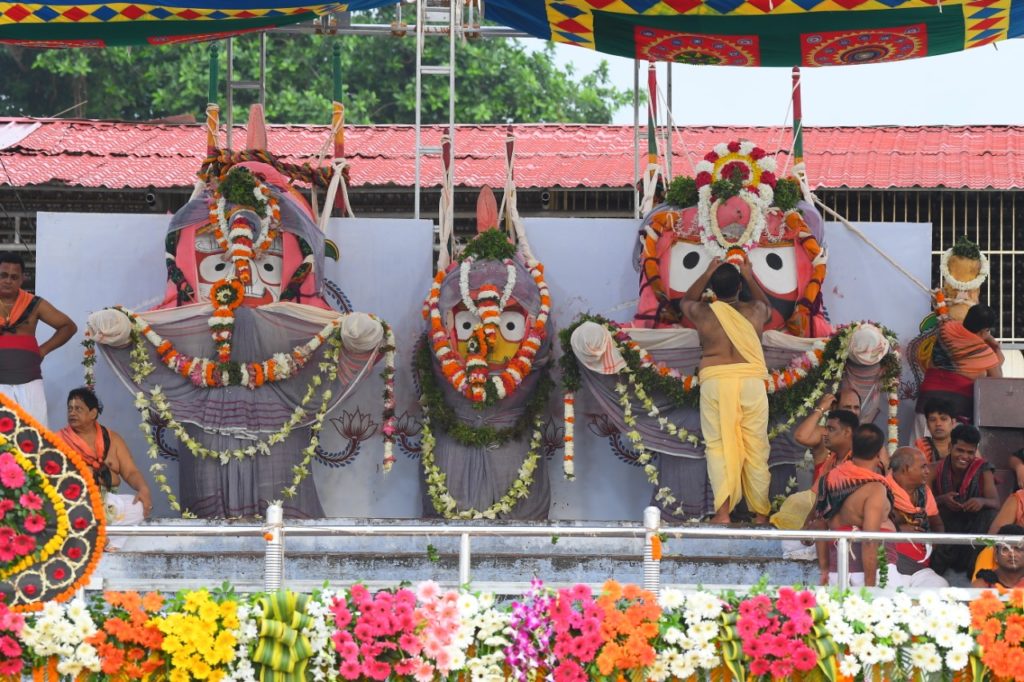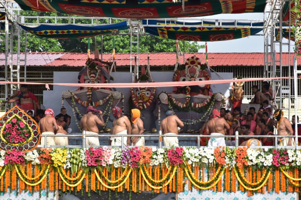 On this occasion, servitors pour 35 pots of sacred water on Lord Jagannath, 33 pots on Lord Balabhadra, 22 on Devi Subhadra and 18 on Sudarsan.