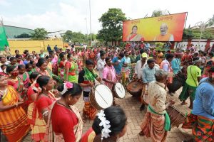 Droupadi, a tribal BJP leader from Odisha’s Mayurbhanj district and former Jharkhand Governor, received a ceremonial reception at the airport with BJP legislator Kusum Tete performing a tribal dance and party’s Bhubaneswar MP Aparajita Sarangi playing the cymbal.