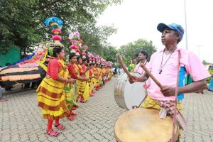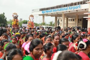 Tribal women dressed in their traditional attire performed folk dances on the streets leading to the airport.