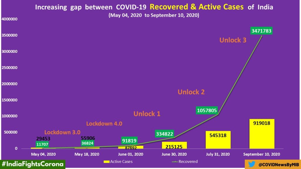 At present, there are 9,19,018 active cases in the country (20.58 per cent of the total cases) and the recovery rate stands at 77.74 per cent. Altogether, 34,71,784 patients in the country have been cured so far with over 72,939 recoveries recorded in the last 24 hours.