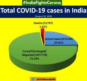About 73.18 per cent (19,77,780) people have recovered, including 57,937 patients in the last 24 hours, while 24.91 per cent (6,73,166) are still under treatment.