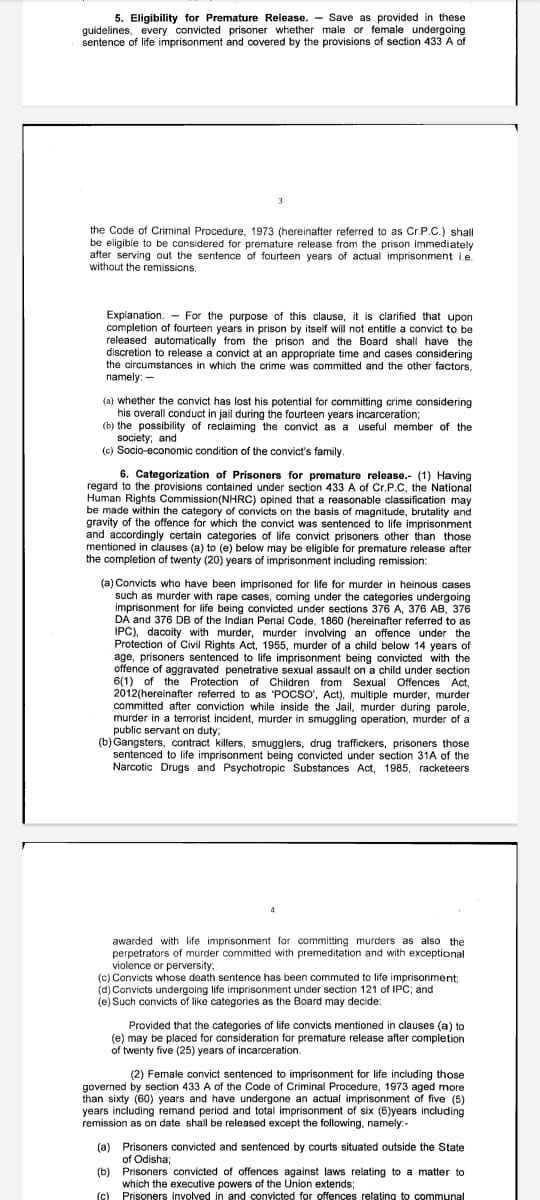 The Law department of the Government of Odisha, in the Guidelines of Premature Release 2022, which supersedes the earlier Resolution of 2010, has amended many of the previous rules of the State Sentence Review Board. The three consideration which are to be taken are: