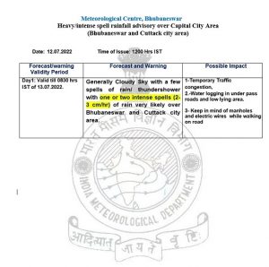 Bhubaneswar: The IMD’s meteorological centre in Bhubaneswar has forecast generally cloudy sky with a few spells of rain/thundershower and one or two intense spells of rain over Bhubaneswar and Cuttack city. The forecast, issued on Tuesday, is valid till 8.30 am Wednesday.