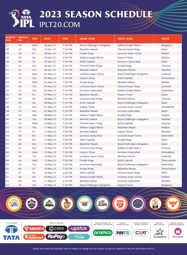 There will be 18 double-headers in IPL-16, with the day games starting at 3.30 pm and evening match from 7.30 pm.