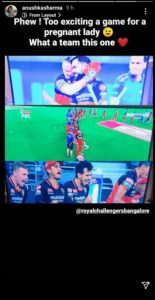 Anushka Sharma took to Instagram to cheer for the team. She put up an Instagram post and wrote, “Phew! Too exciting a game for a pregnant lady! What a team this one!” She shared a collage of photos of the jubilant RCB players celebrating their victory.