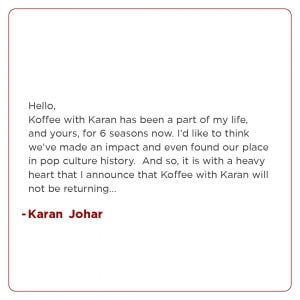 The filmmaker, however, on Wednesday announced that there will be no new season of his talk show. Sharing a note, Karan wrote, “Hello, Koffee With Karan has been a part of my life and yours, for 6 seasons now. I’d like to think we made an impact and even found our place in pop culture history. And so, it is with a heavy heart that I announce that Koffee With Karan will not be returning.”