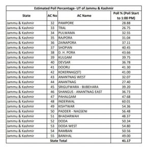New Delhi: With polling for the first phase of the election to the J&K Legislative Assembly receiving huge momentum, all polling stations of 24 Assembly constituencies across seven districts of Jammu & Kashmir recorded an impressive 41.17 per cent voter turnout till 1 pm, said the Chief Electoral Officer.
