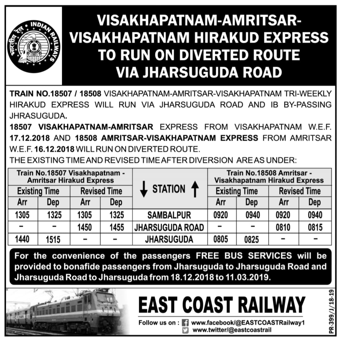 According to a EcoR statement, Visakhapatnam-Amritsar- Visakhapatnam tri-weekly Hirakud Express is the first train to be diverted from Tuesday onwards. It will run via Jharsuguda Road – IB-Belpahar stations — running on this route until further notice.