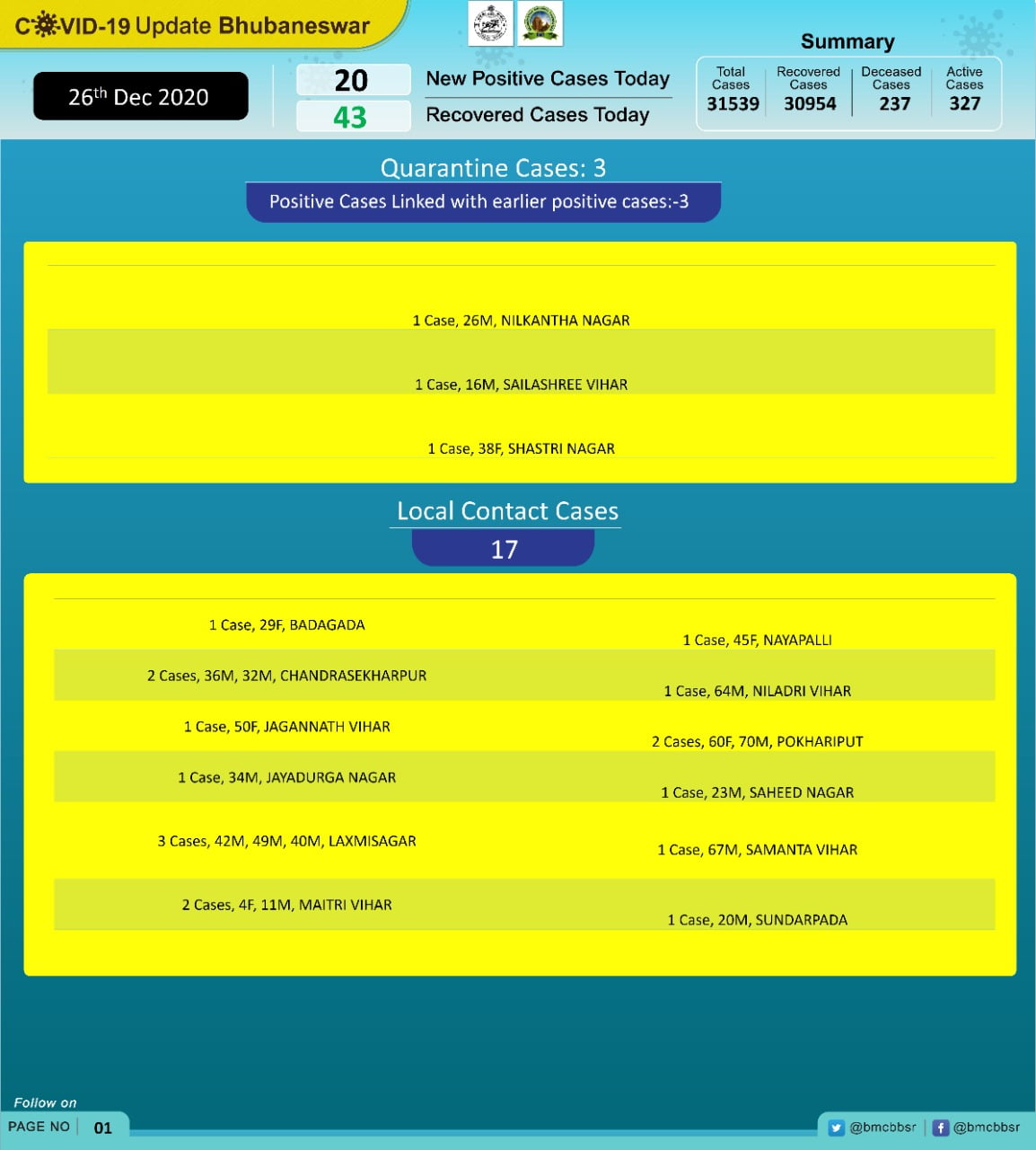 Bhubaneswar: The number of new COVID-19 positive cases has gone down. With 20 fresh cases being reported in the last 24 hours, the tally in Bhubaneswar went up to 31,539 on Saturday.