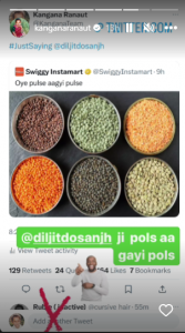 Kangana shared a post from Swiggy India on her Instagram Stories and Twitter account. The post shows a variety of pulses with “pulse aagai pulse” written on it. She tagged Diljit in her tweet and wrote “just saying”. On Instagram Stories, she wrote, “Diljit Dosanjh ji pols aagai pols.”