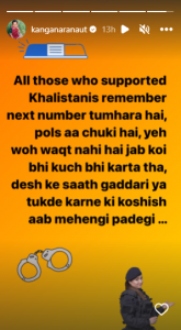 In another Story, she wrote, “All those who supported Khalistanis remember next number tumhara hai, pols aa chuki hai, yeh woh waqt nahi hai jab koi bhi kuch bhi karta tha, desh ke saath gaddari ya tukde karne ki koshish ab mehengi padegi (Remember next up in you. The police is here. One cannot do whatever they wish to anymore. Betraying the country or wanting to destroy it will cost you big time).”