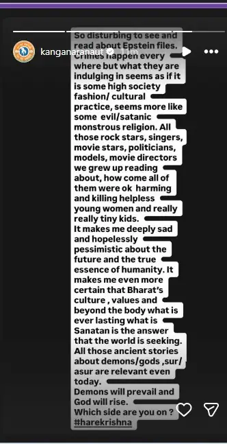 “So disturbing to see and read about Epstein Files. Crimes happen everywhere but what they are indulging in seems as if it is some high society fashion/cultural practice, seems more like some evil/satanic monstrous religion. All these rockstars, singers, movie stars, politicians, models, movie directors, we grew up reading about, how come all of them were ok harming and killing helpless young women and really really tiny kids,” Kangana posted on her Instagram Stories on Tuesday.