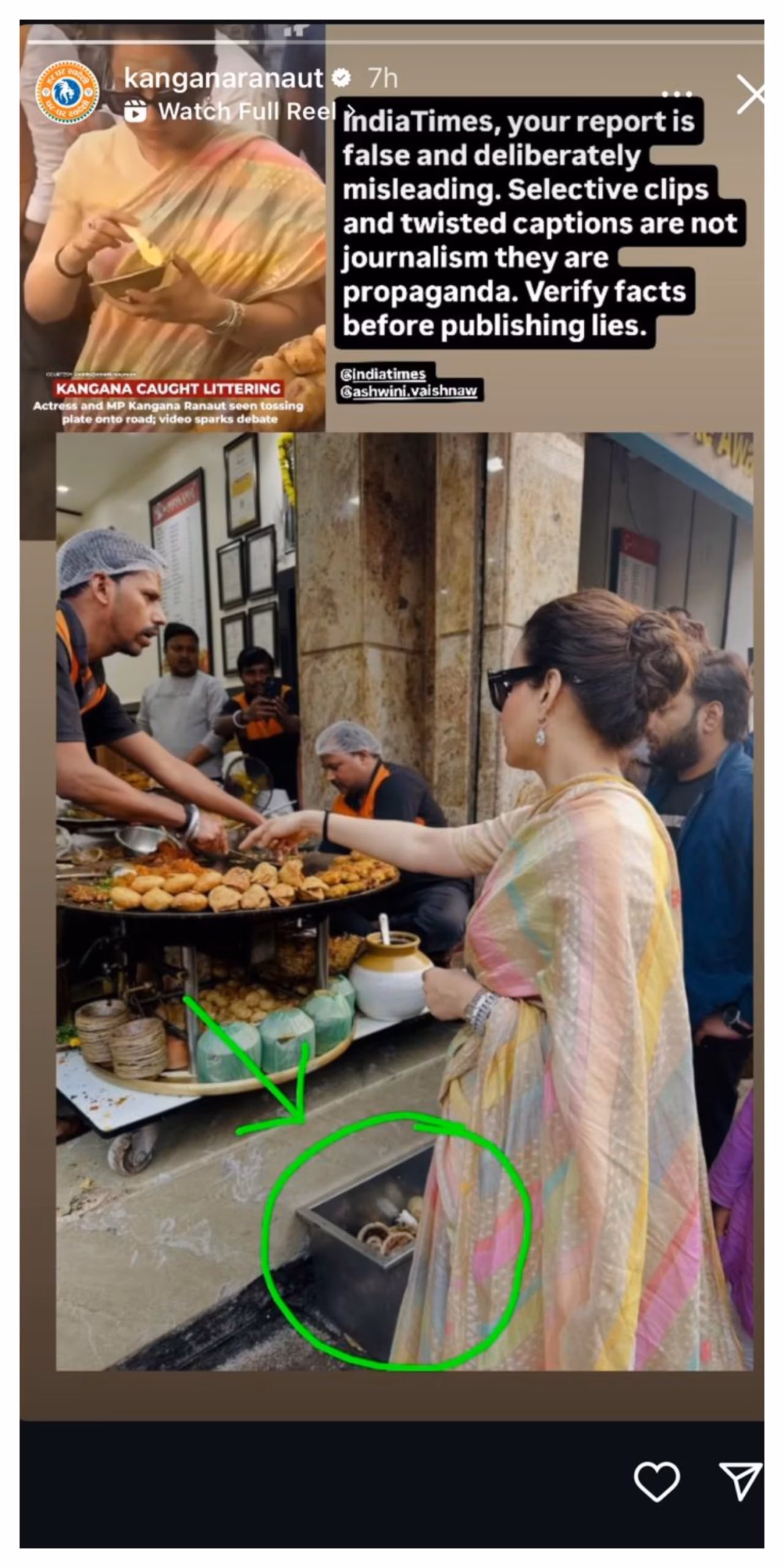 Setting the record straight, the actress took to her Instagram Stories and shared a picture of herself at the street food stall, which had a dustbin where she apparently disposed of the plate.