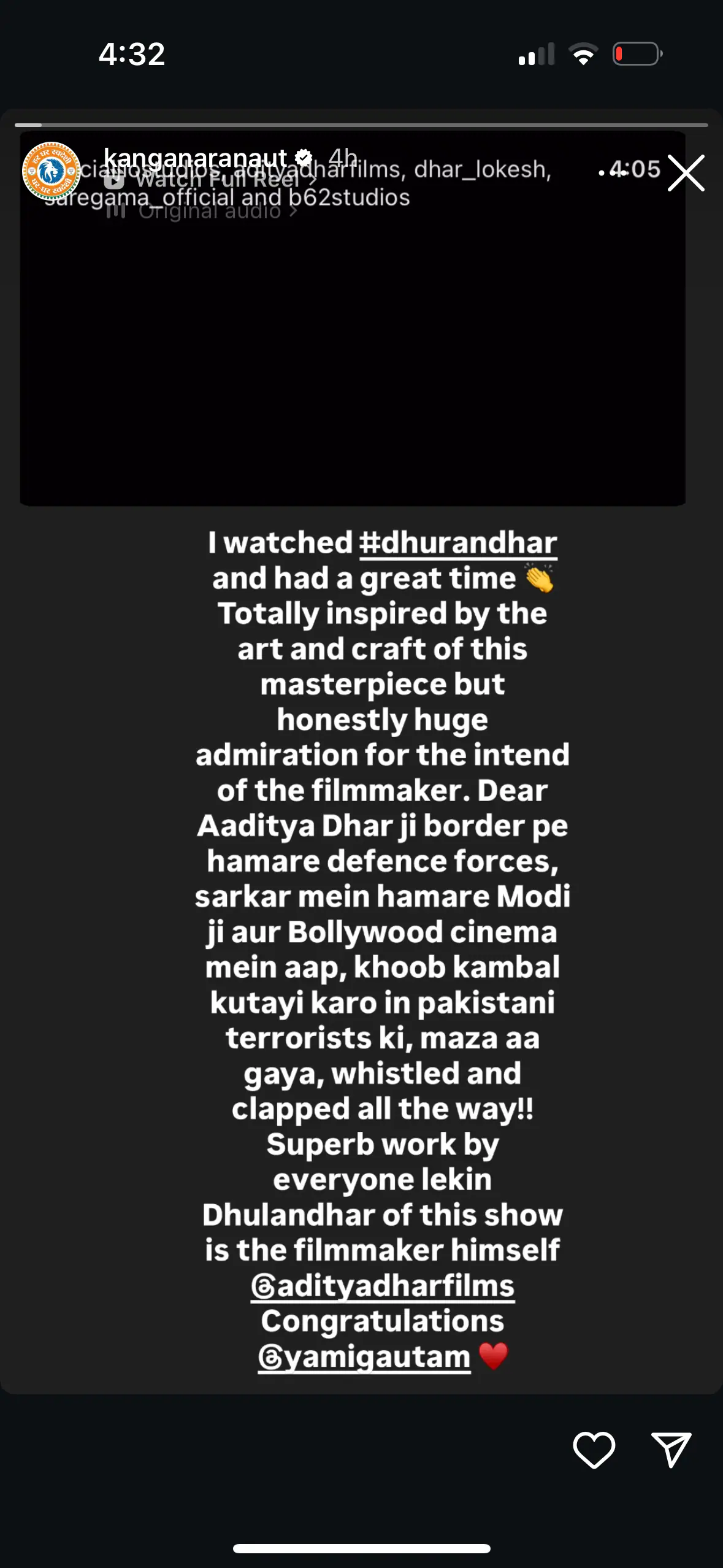Reviewing the film, Kangana took to her Instagram handle and wrote, “I watched #dhurandhar and had a great time 👏. Totally inspired by the art and craft of this masterpiece but honest huge admiration for the intent of the filmmaker. Dear Aaditya Dhar ji border pe hamare defence forces, sarkar mein hamare Modi ji aur Bollywood cinema mein aap, khoob kambal kutayi karo in pakistani terrorists ki, maza aa gaya (On our border, it is our defence forces, in the government, it’s Prime Minister Modi and in our cinema, it’s you. Beat up those Pakistani terrorists. Had so much fun), whistled and clapped all the way!! Superb work by everyone lekin Dhurandhar of this show is the filmmaker himself @adityadharfilms. Congratulations Yami Gautam.”