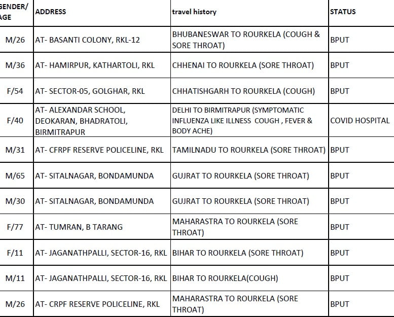 12 cases were reported today., the details of 11 are in the image below. The last case is a male, admitted to VIMSAR, Burla and tested positive there, he is from Kuturma, Hemgiri. Contact tracing is going on and a decision regarding containing the area will be taken today. https://t.co/TIBKDIXuCQ pic.twitter.com/dCGxDEy20m
