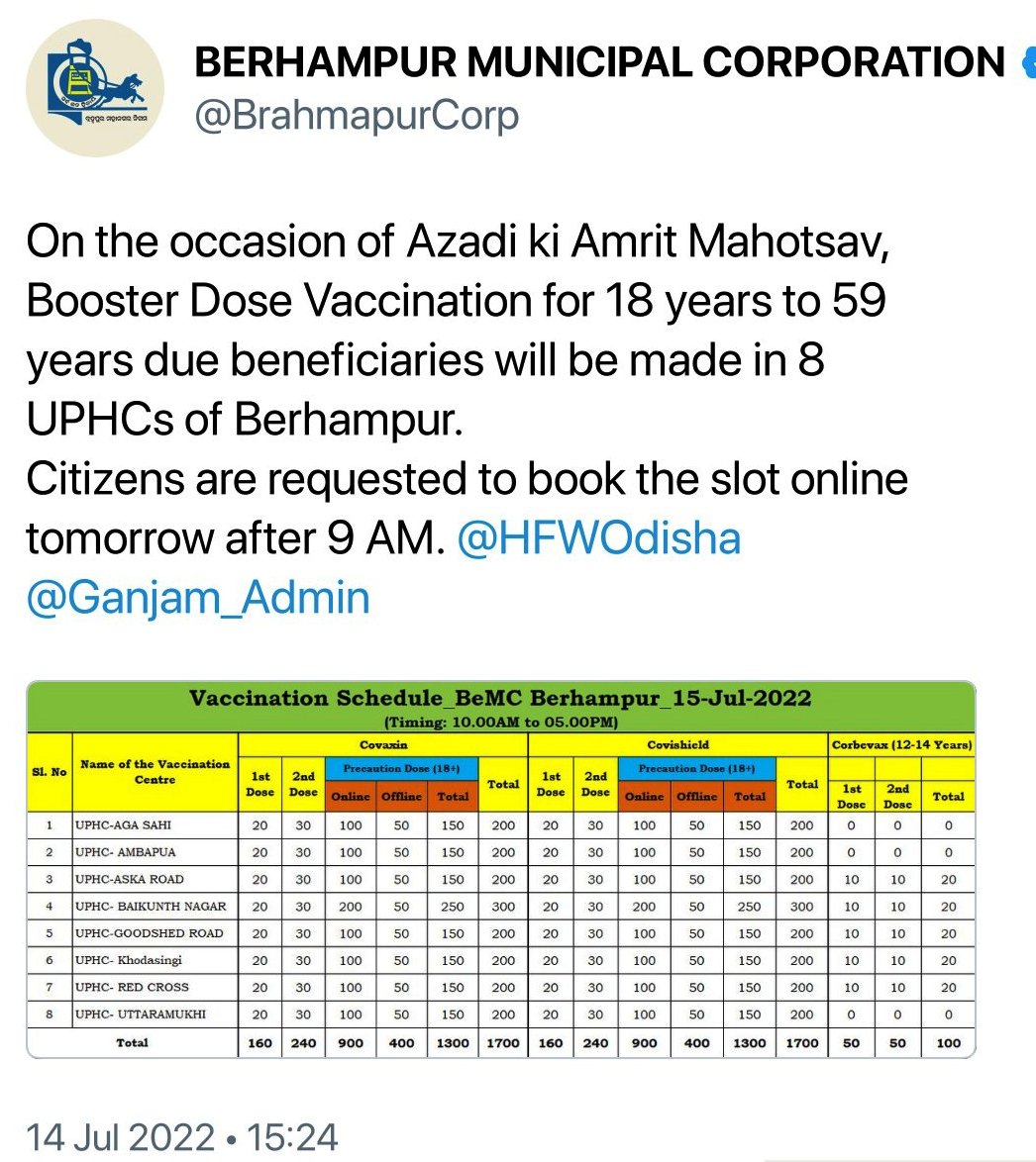 Similarly in Berhampur, booster doses are being made available at 8 UPHCs from Friday. Citizens have been requested to book the slot online after 9 am..