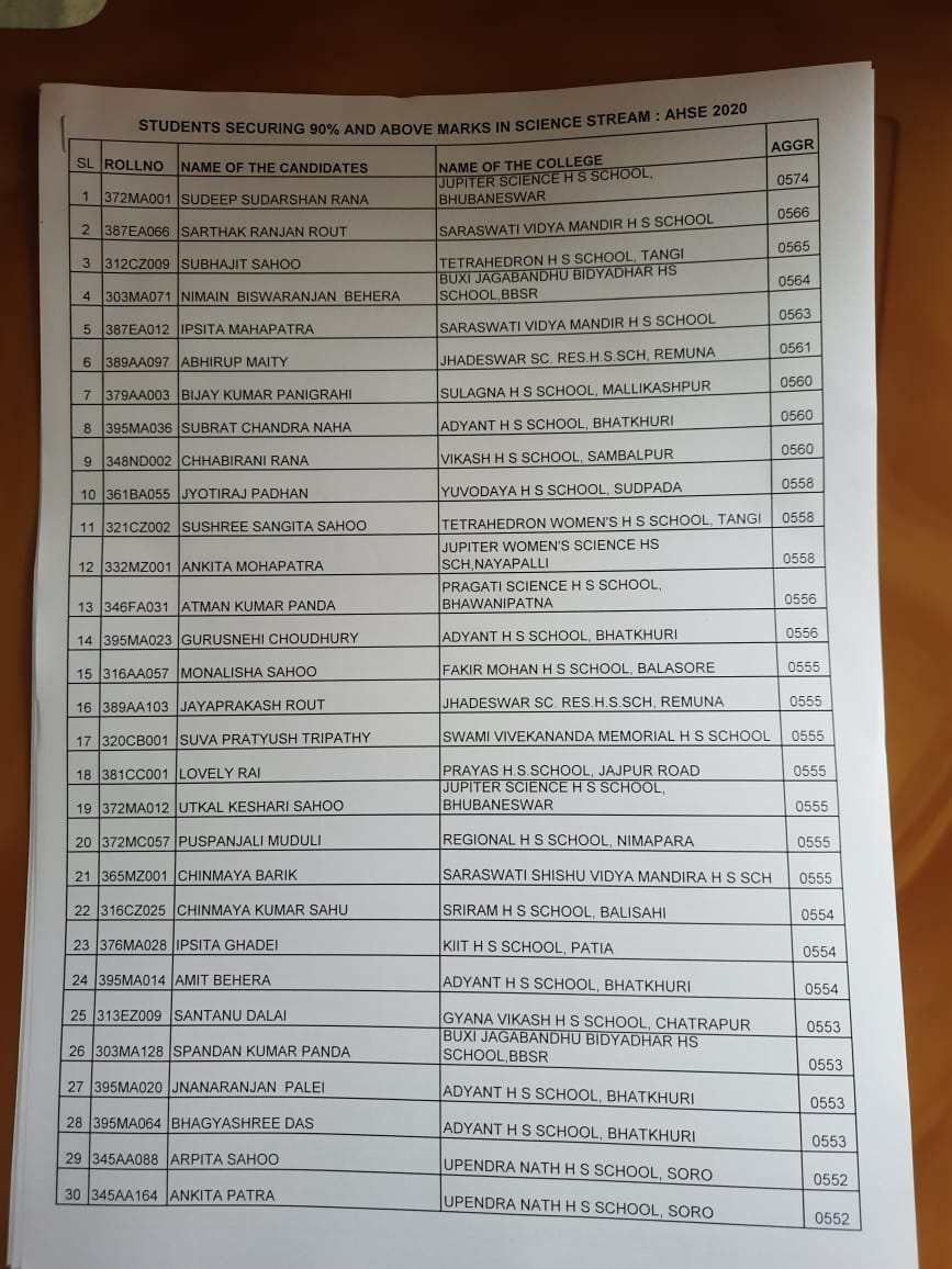 While Sudeep Sudarshan Rana of the Jupiter Science Higher Secondary School in Bhubaneswar has topped the list with 574 of 600 marks, Sarthak Ranjan Rout of Saraswati Vidya Mandir Higher Secondary School and Subhajit Sahu of Tetrahedron Higher Secondary School, Tangi, in Cuttack have secured second and third position with 566 and 565 marks respectively.
