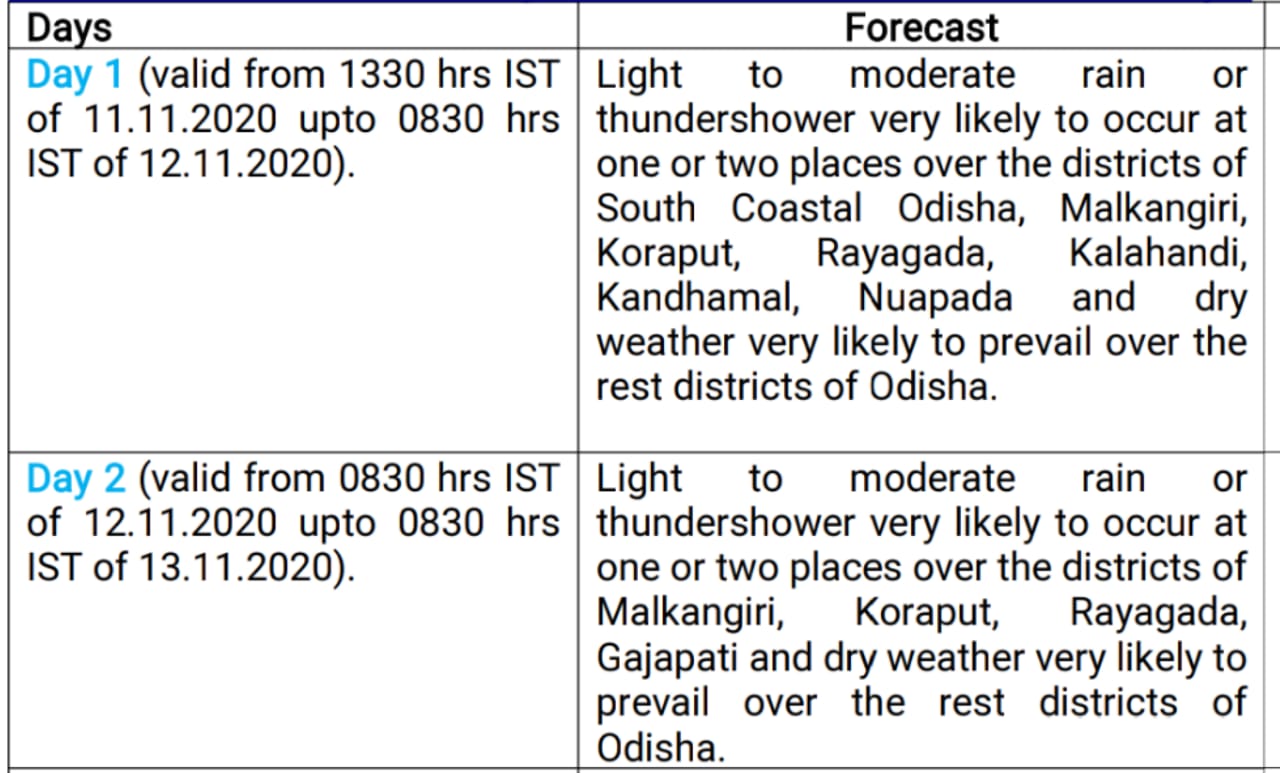 Bhubaneswar: Director of Bhubaneswar Meteorological Centre H R Biswas on Wednesday said that isolated places in south coastal and interior Odisha are likely to experience light to moderate rainfall in the next two days under influence of an easterly trough from south-west Bay of Bengal to west-central Bay of Bengal.