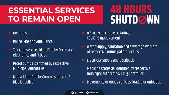 Bhubaneswar: Some essential services will remain open during the 48-hour shutdown in Bhubaneswar, Cuttack and Bhadrak town starting 8 pm on Friday, to contain possible community transmission of COVID-19 in Odisha.