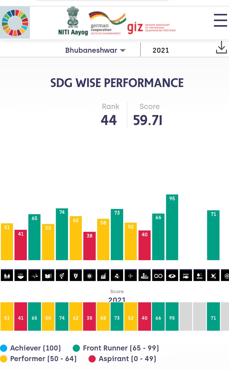 Bhubaneswar, however, has scored a high of 95 in Climate Action and has been adjudged frontrunner in Good Health and Well Being; Gender Equality, Industry, Innovation and Infrastructure; Ensuring Sustainable Consumption and Production Pattern; and Speed, Justice and Strong Institution goals.