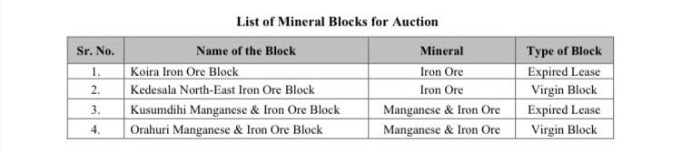 These 4 mineral blocks are Koira iron ore block, the lease of which has expired, Kedesala North-East iron ore virgin block, Kusumdihi manganese and iron ore block, whose lease has expired, and Orahuri manganese and iron ore virgin block.
