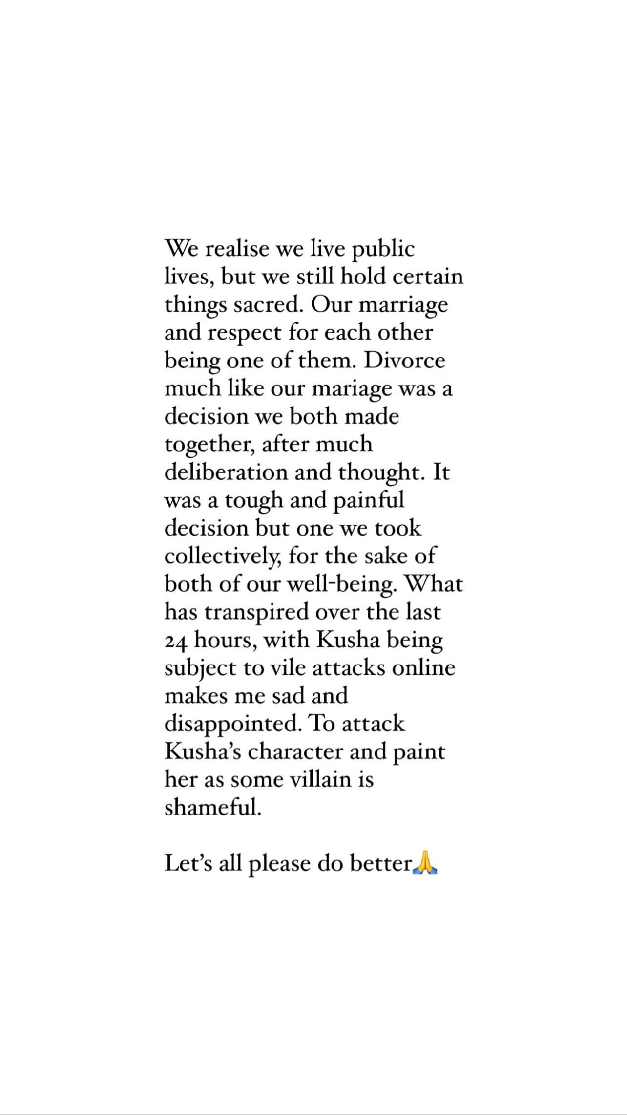 Taking to his Instagram Story, Zorawar wrote, “We realise we live public lives, but we still hold certain things sacred. Our marriage and respect for each other being one of them. Divorce much like our marriage was a decision we both made together, after much deliberation and thought. It was a tough and painful decision but one we took collectively, for the sake of both of our well-being. What has transpired over the last 24 hours, with Kusha being subject to vile attacks online makes me sad and disappointed. To attack Kusha’s character and paint her as some villain is shameful. Let’s all please do better.”