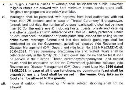 During this period, the number of attendees in wedding ceremonies has been capped at 25, including the bride, the groom and priests. The ceiling for the number of participants in thread ceremony/ funerals/ last rites has been limited to 20. Only family members can attend thread ceremony and other related rituals.