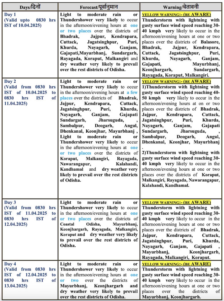 Light to moderate rain may continue in the afternoon/evening hours at one or two in Mayurbhanj, Keonjhar and Balasore districts on April 13; Balasore, Bhadrak, Keonjhar, Mayurbhanj, Sundargarh, Dhenkanal, Angul, Jajpur and Kendrapada on April 14 and coastal Odisha, Mayurbhanj, Keonjhar, Angul, Dhenkanal, Rayagada, Malkangiri, Koraput, and Nabarangpur on April 15, with little change in the weather conditions during the subsequent three days.
