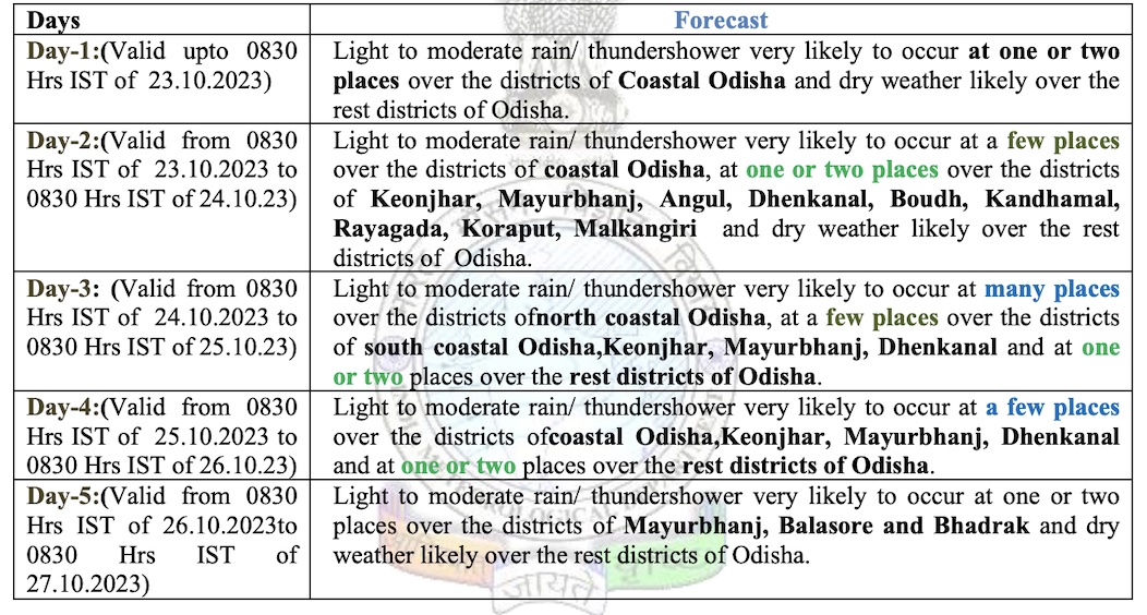 Squally wind speed reaching 40- 50 kmph gusting to 60 kmph is likely over North Bay of Bengal off Odisha coast on October 23 and it likely to increase gradually becoming gale wind speed reaching 60-70 kmph gusting to 80 kmph on October 24 and gradually decrease thereafter over north Bay of Bengal. Also, squally wind speed 45-55 kmph gusting to 65 kmph is very likely along and off Odisha coast from October 24-26.