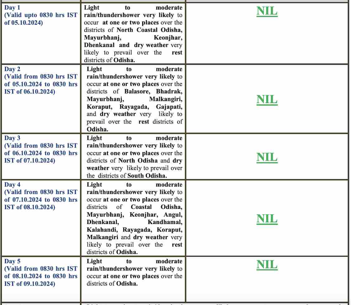 The weather agency has also forecast light to moderate rain/thundershower at one or two places in North Coastal Odisha, Mayurbhanj, Keonjhar and Dhenkanal till 8.30 am on Saturday.