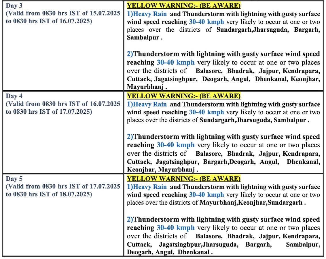 On July 13, the IMD has also issued yellow warning of heavy rain accompanied by thunderstorm/lightning and gusty surface wind speed reaching 30-40 kmph at one or two places in Angul, Dhenkanal, Cuttack, Nayagarh, Boudh, Sonepur, Deogarh, Bolangir, Kandhamal and Kalahandi. Thunderstorm/lightning with gusty surface wind speed reaching 30-40 kmph may also occur at one or two places over the districts of Balasore, Bhadrak, Jajpur, Kendrapada, Jagatsinghpur, Puri, Khurda, Ganjam, Gajapati.