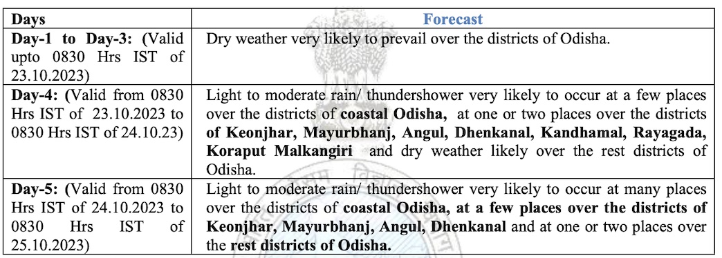 Bhubaneswar: After a brief spell of dry weather, Odisha is likely to experience light to moderate rain from October 23, the India Meteorological Department (IMD) informed on Friday.