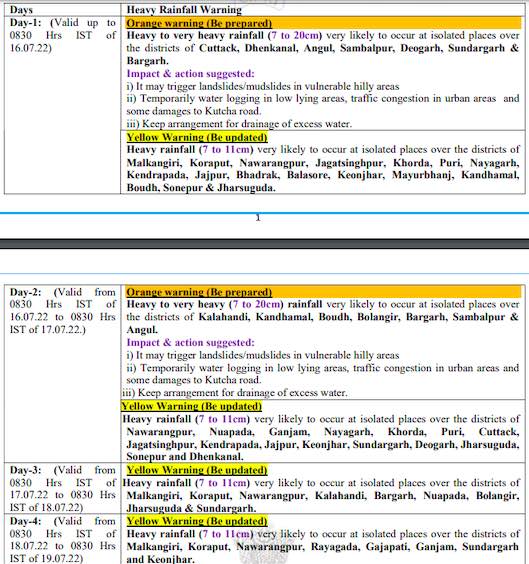 The MeT office has issued orange warning for heavy to very heavy rainfall at one or two places in Cuttack, Dhenkanal, Angul, Sambalpur, Deogarh, Sundargarh and Bargarh during the next 24 hours. Heavy rainfall is also likely at one or two places in Malkangiri, Koraput, Nabarangpur, Jagatsinghpur, Puri, Khurda, Nayagarh, Kendrapara, Jajpur, Bhadrak, Balasore, Keonjhar, Mayurbhanj, Kandhamal, Boudh, Sonepur, Jharsuguda during this period.