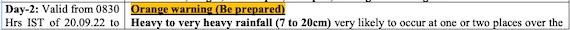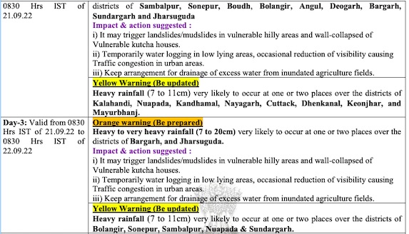 Till 8.30 am on September 20, heavy to very heavy rainfall (7 to 20cm) is likely at one or two places in Puri, Khurda, Cuttack, Nayagarh, Jagatsinghpur, Boudh, Kalahandi, Kandhamal, Nabarangpur and Koraput. Yellow warning for heavy rainfall (7 to 11cm) has also been issued for one or two places in Gajapati, Malkangiri, Rayagada, Khordha, Kendrapada, Bhadrak, Balasore, Jajpur, Dhenkanal, Angul, Sambalpur, Sonepur, Balangir and Bargarh during this period.